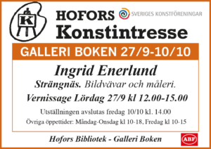 Välkommen på vernissage lördag 16/11 mellan kl.12-15 i Galleri Boken, Hofors Bibliotek. Utställningen pågår sedan fram till fredag 6 december kl.14, under bibliotekets öppettider.